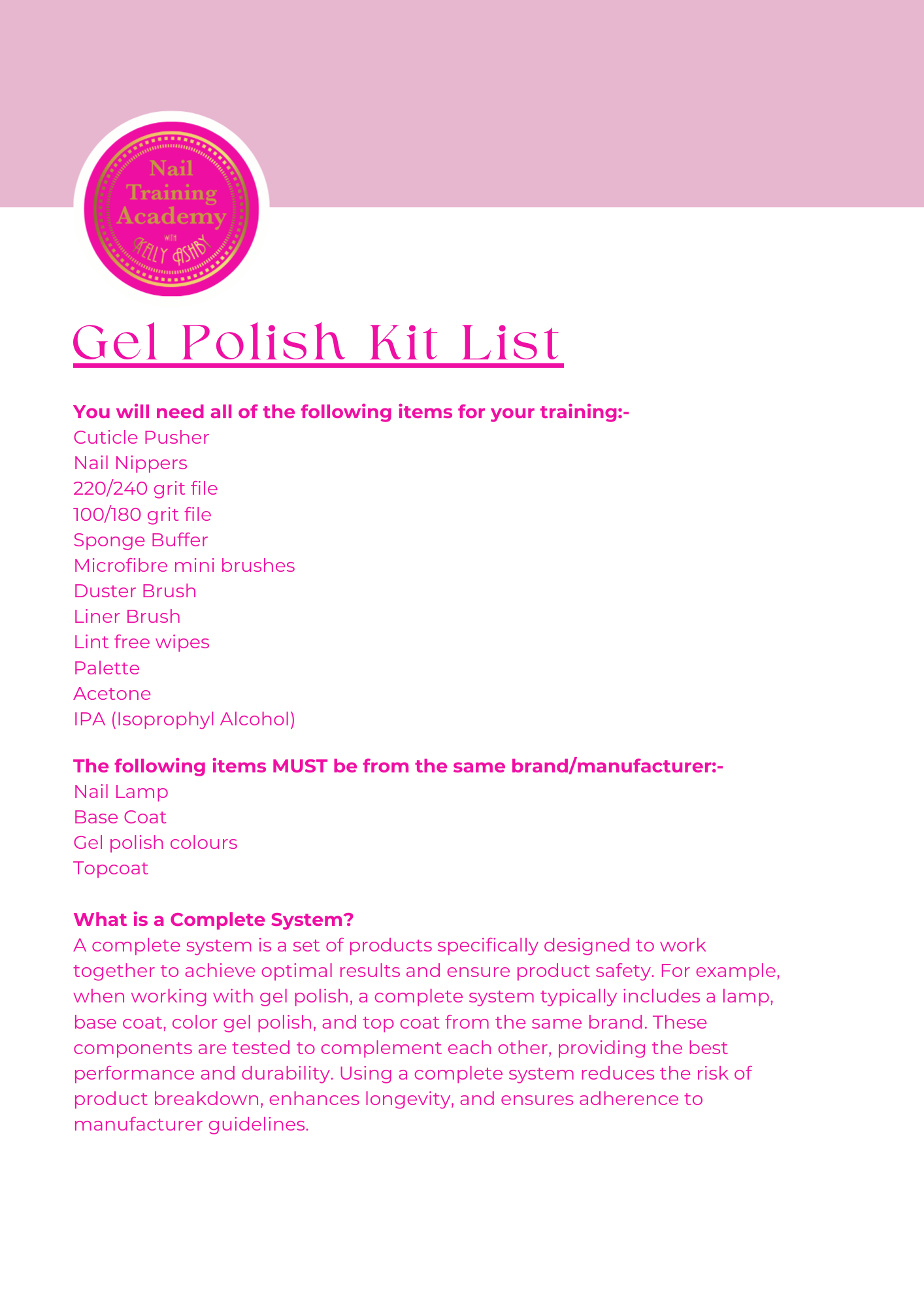 By booking a training course with Kelly Ashby Nail Academy, you agree to the following terms. All training fees are non-refundable and non-transferable if cancellation is made less than seventy two hours before the scheduled course date. Places are limited and bookings are confirmed upon receipt of payment. Training dates, times and locations will be confirmed by email. Certificates are issued on successful completion of the course. The academy reserves the right to reschedule training where necessary.